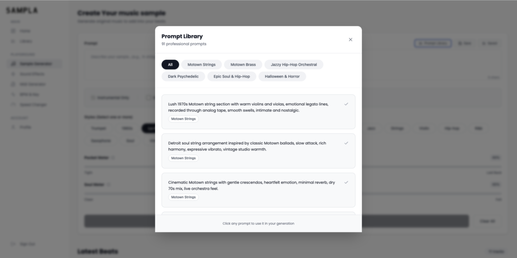 Most AI music generators give you vague genre tags (“hip hop,” “jazz,” “soul”). Sampla’s Prompt Library was built by producers who understand sampling aesthetics: